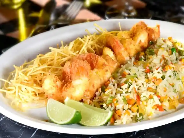 5 camarões à milanesa. Acompanha arroz à grega e batata palha